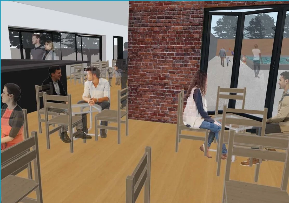 The cafe is designed to easily allow viewing of the pool to be closed off, this facilitates the needs of muslim women for whom swimming in a public setting is often inappropriate.